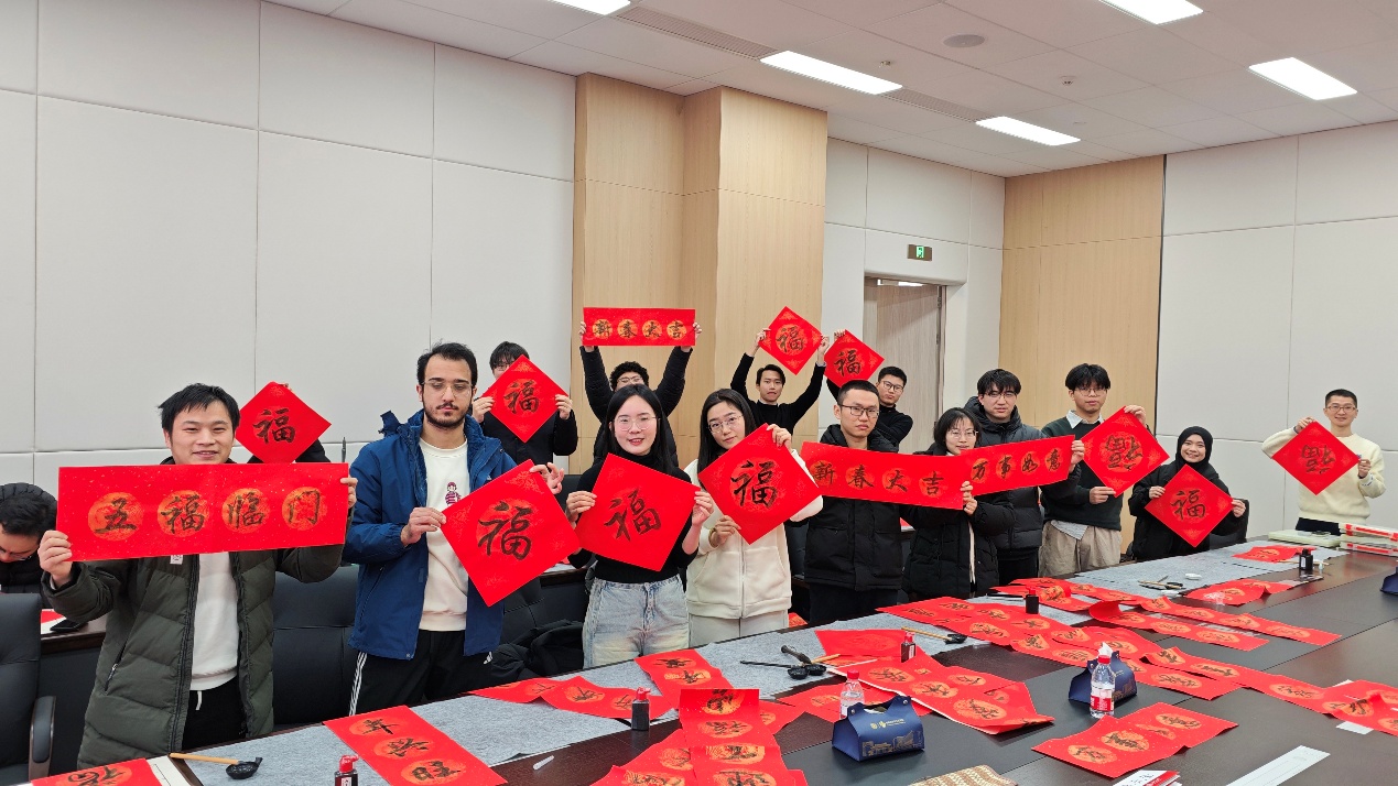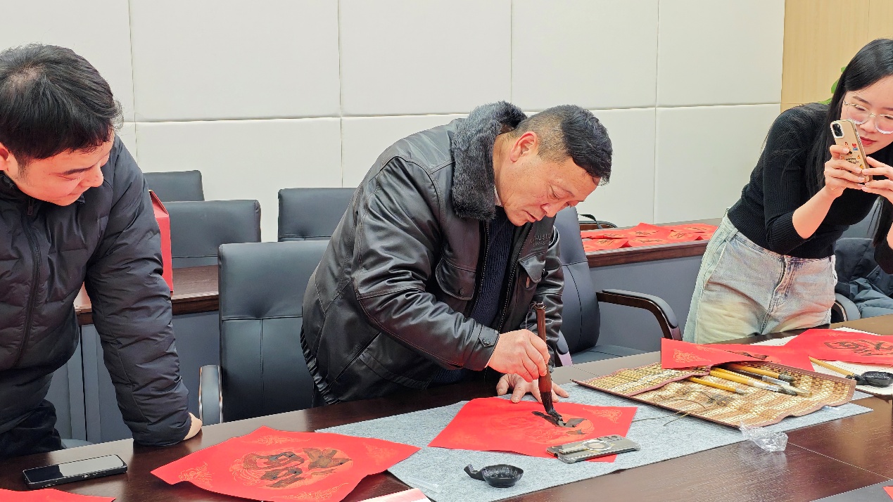 在“迎春接福·墨香送暖”写春联环节,师生一同铺纸研磨,挥毫书写新年祝福。一幅幅寓意吉祥的春联和“福”字在笔尖诞生,红纸黑字间流淌着温馨的年味与文化的情怀。