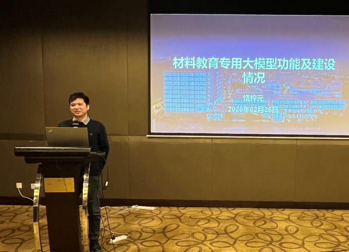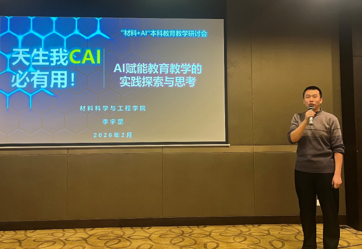 教师代表饶梓元、李宇罡、刘钧分别作主题报告,分享了材料教育专用大模型功能和建设情况、AI赋能教育教学的实践思考、中外高校材料学科培养方案的比较分析。